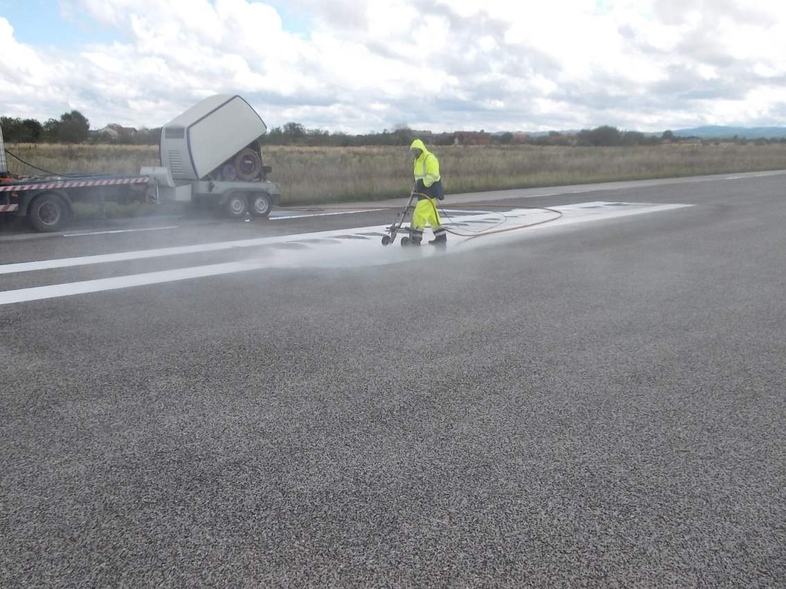 Posebnost letališč so tudi sledi udarcev nastalih pri spuščanju letal. Kako to odstraniti in očistiti? Tudi tu je v pomoč naša strojna oprema. Kakor je že zgoraj navedeno, z učinkovito nastavitvijo moči vodnega curka v posameznih vodnih rezalnih nožev lahko brez sledi odstranimo tudi ostanke in sledi gum. Odstranimo tudi nesnago v fugah dilatacij, izvedemo pa tudi razrez asfalta oz betona in naredimo po potrebi nove fuge.