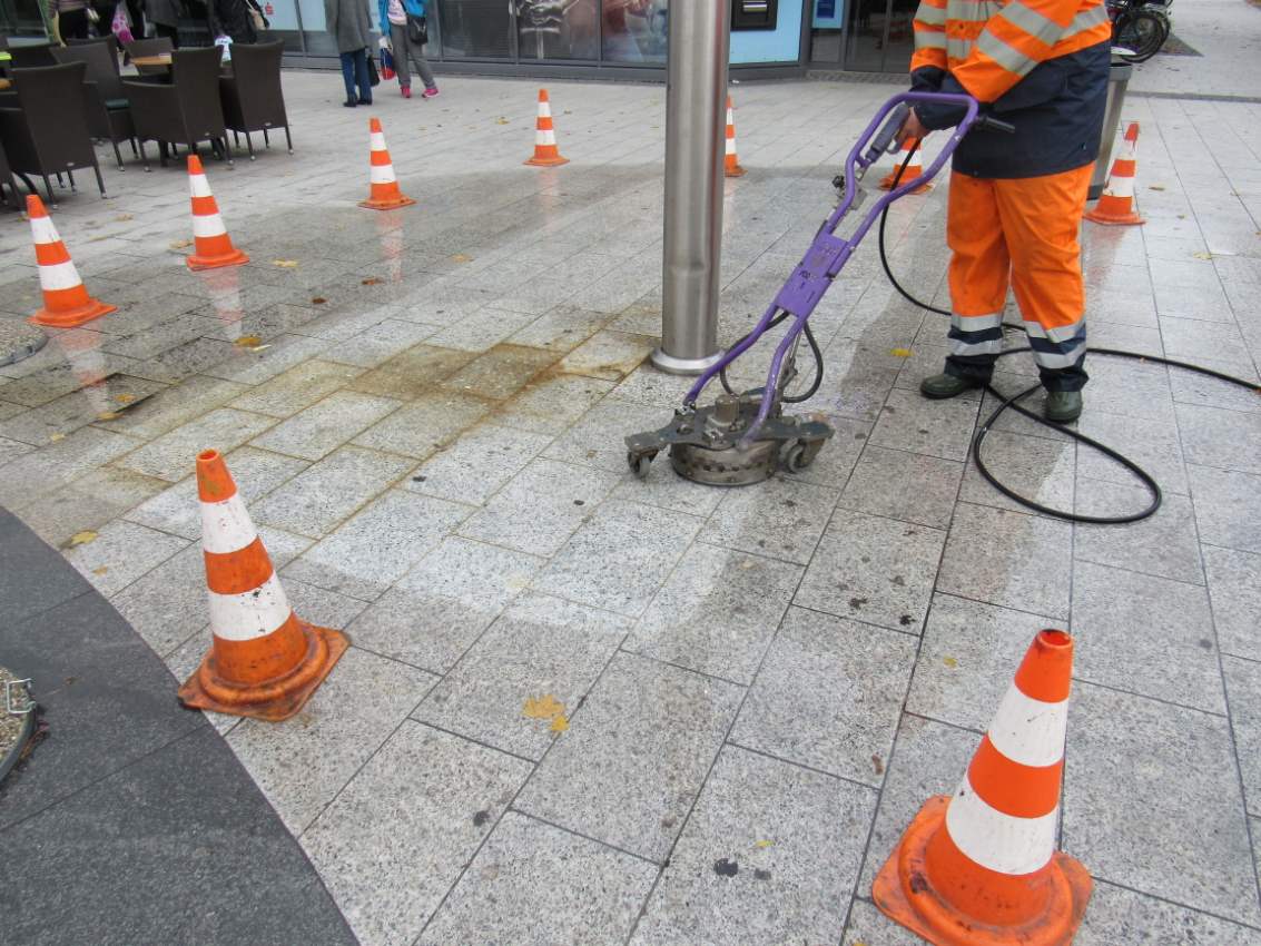 Bistvo delovanja naše opreme je, da se voda pod visokim pritiskom (max 2500 barov – ne uporabljamo nobenih kemikalij, le toplo vodo, če je potrebno), izteka po posebnih »šobah« (ali ročnih pištolah) in rotirajoče brizga vodo po umazanih površinah iz kamna, betona ali asfalta. Voda pod visokim tlakom odstranjuje še tako trdovratne materiale (barve, rjo, betone, cementne nanose, fasadne malte in lepila itd). Zaradi možnosti nastavitve pritiska je možna izvedba in odstranjevanje materialov različne trdote in v različnih »globinah«, kar raznolikost uporabe še bistveno poveča.