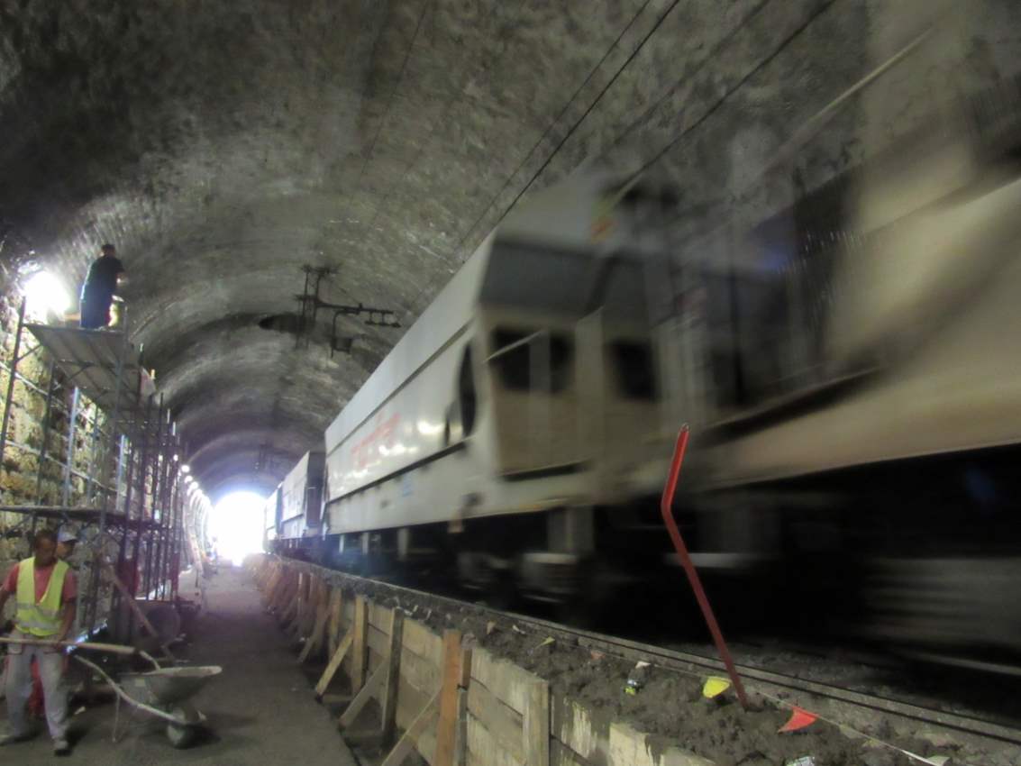 - Visokotlačno pranje in odbijanje slabega betona desnega dela predora pri katerem je izvajanje del izvedeno brez da so se izklopili električna napajanja, ki je bilo predvideno na minimalni razdalji 3,5 m od sredine tirnice oz električne napeljave po vrhu oboka tunela, in se je izvajalo z robotom, v višini do stika obokov (cca 7,5 m) – delovni pritisk je 1800 bar, oddaljenost šobe je cca 0,7 do 1,0 m, rotacijska šoba, izvajalo se je v tri v dva nivoja in sicer v višini do 5 m in od 5 do 7,5 m;