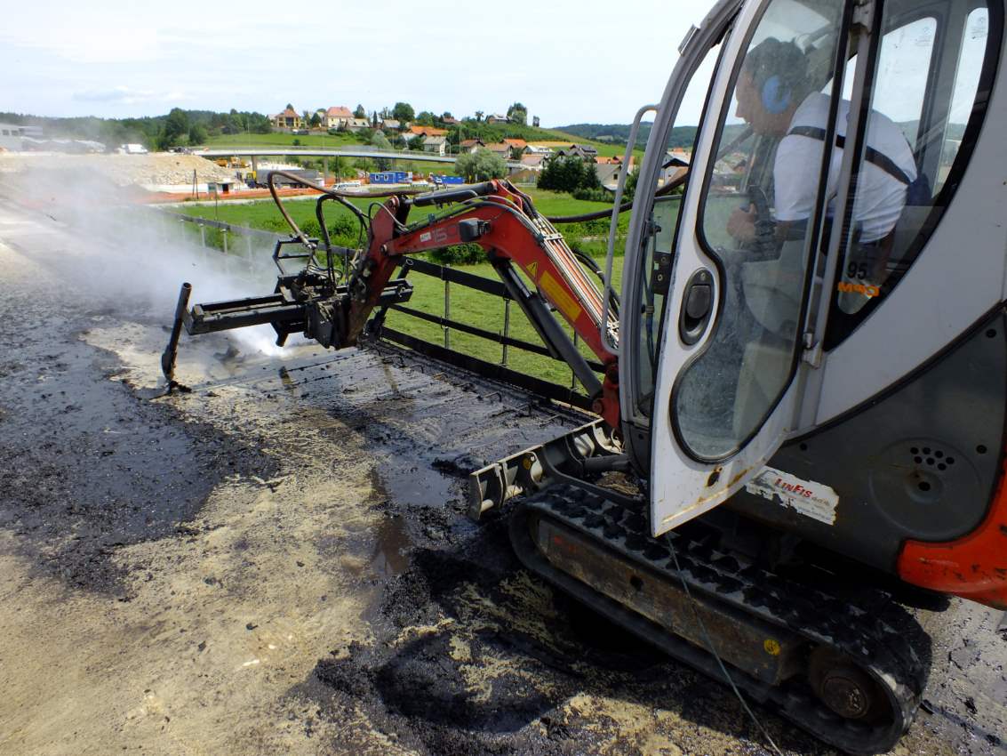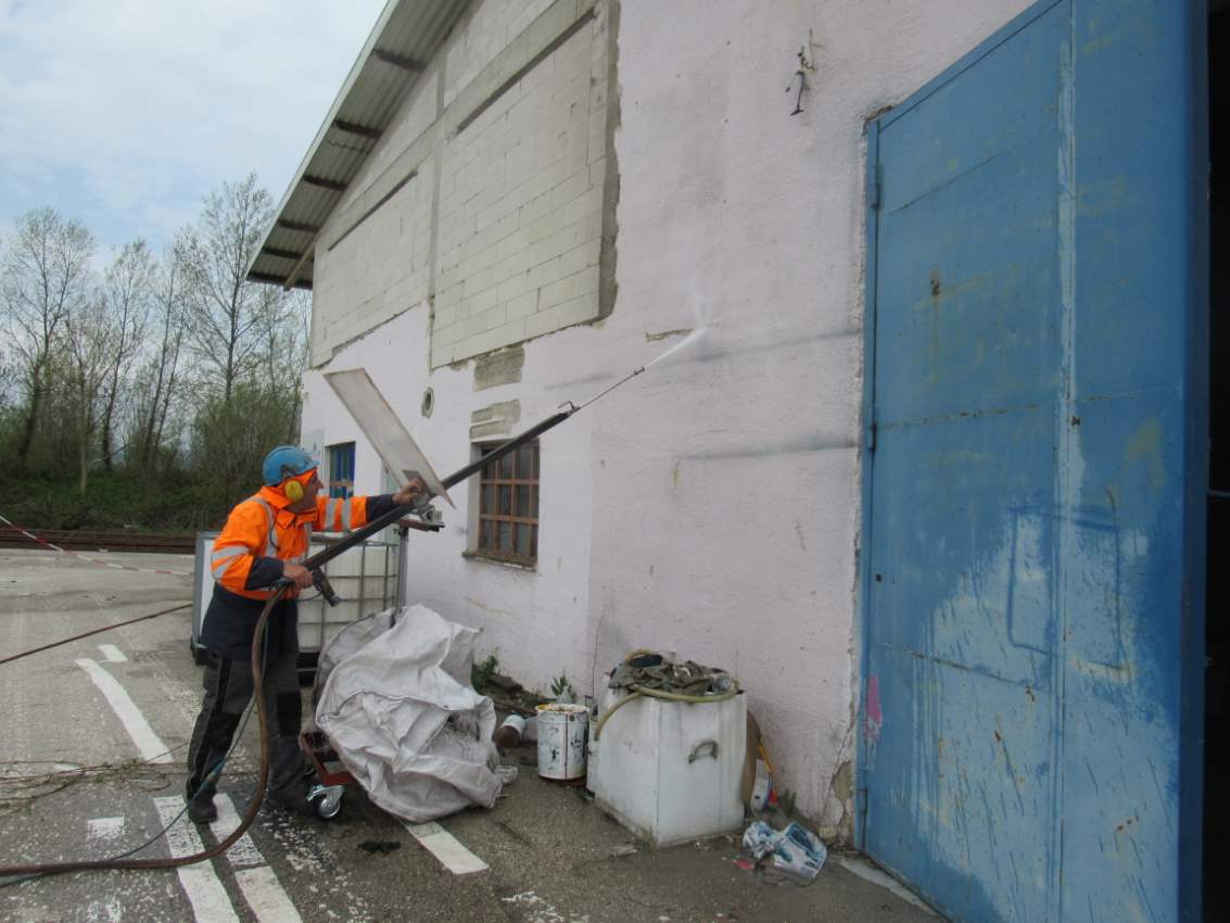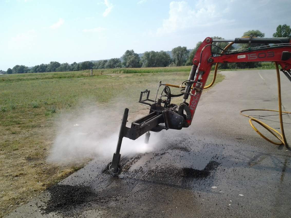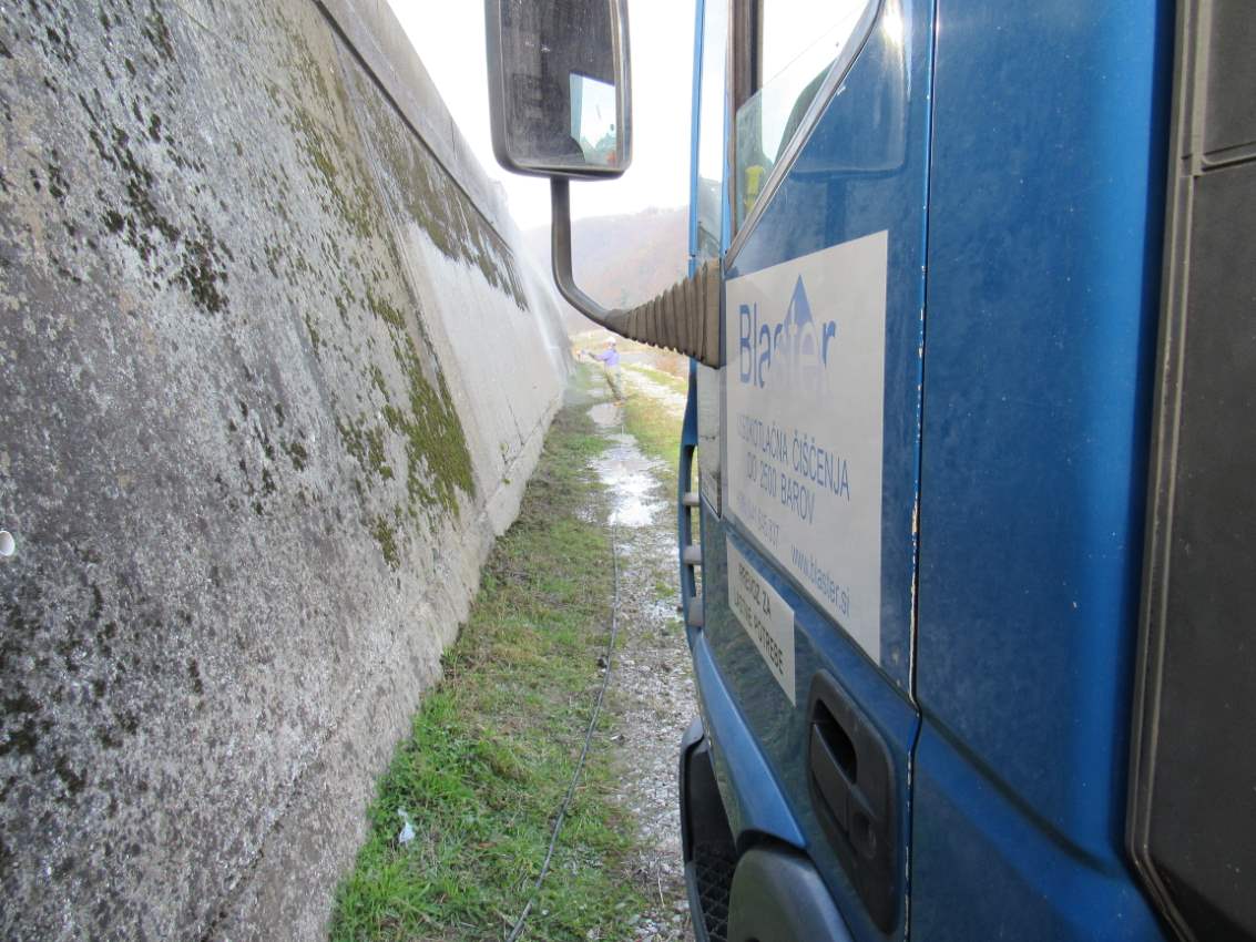 Odbijanje delov poškodovanega betona se izvaja z robotom, delovni pritisk cca 2200 do 2400 bar s katerim se bo predvidoma odstrani ves oslabeli beton.