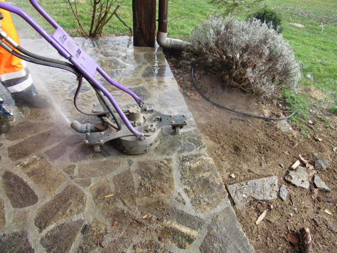 Bistvo delovanja naše opreme je, da se voda pod visokim pritiskom (max 2500 barov – ne uporabljamo nobenih kemikalij, le toplo vodo, če je potrebno), izteka po posebnih »šobah« (ali ročnih pištolah) in rotirajoče brizga vodo po umazanih površinah iz kamna, betona ali asfalta. Voda pod visokim tlakom odstranjuje še tako trdovratne materiale (barve, rjo, betone, cementne nanose, fasadne malte in lepila itd). Zaradi možnosti nastavitve pritiska je možna izvedba in odstranjevanje materialov različne trdote in v različnih »globinah«, kar raznolikost uporabe še bistveno poveča.