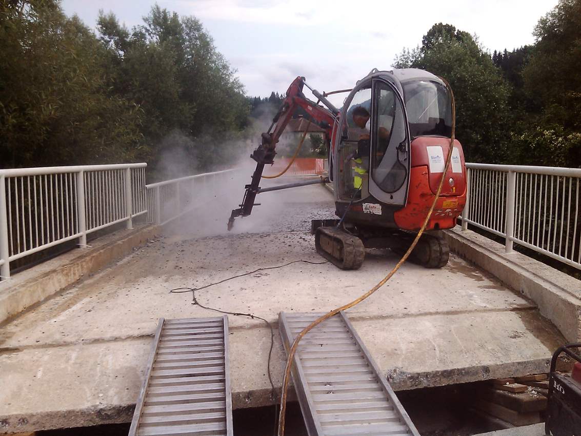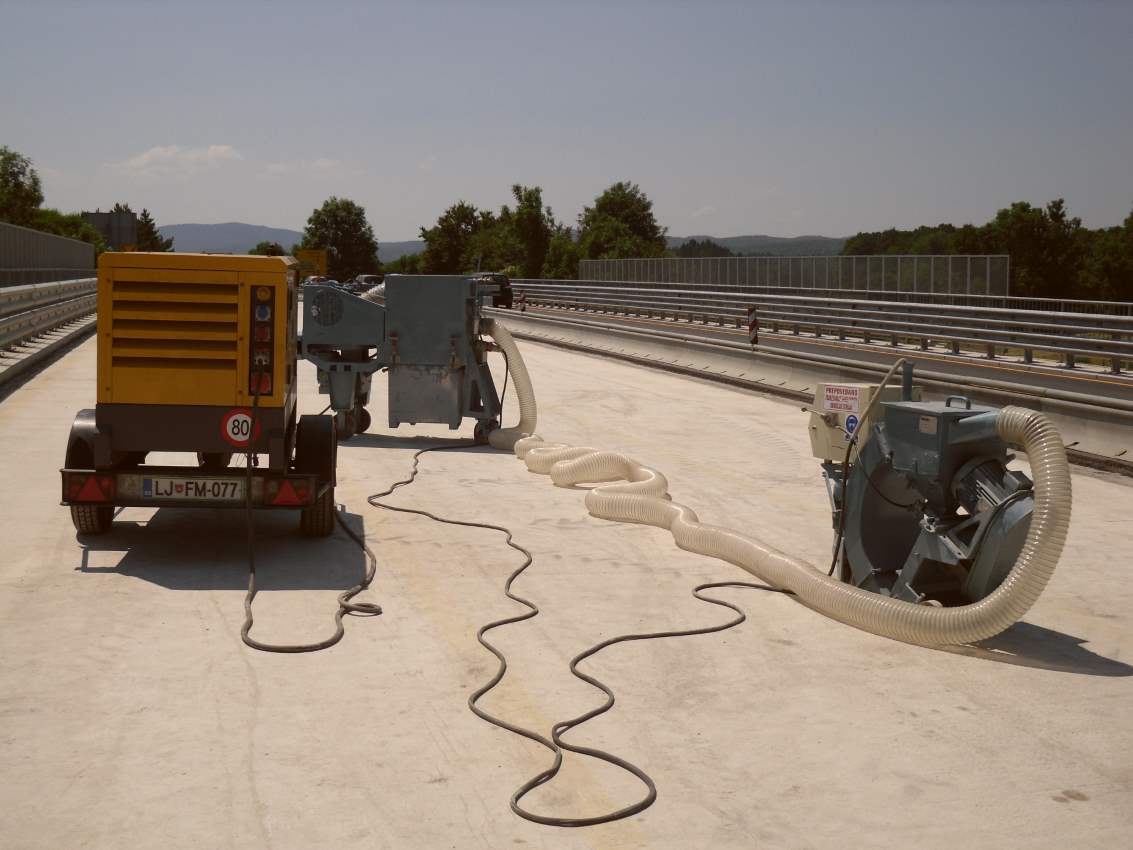 Odbijanje delov poškodovanega betona se izvaja z robotom, delovni pritisk cca 2200 do 2400 bar s katerim se bo predvidoma odstrani ves oslabeli beton.